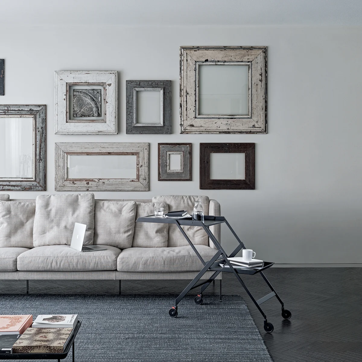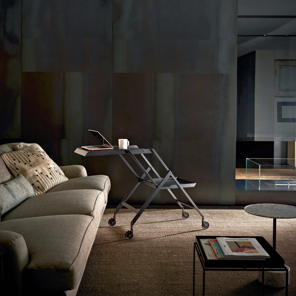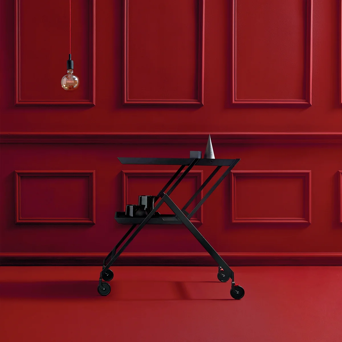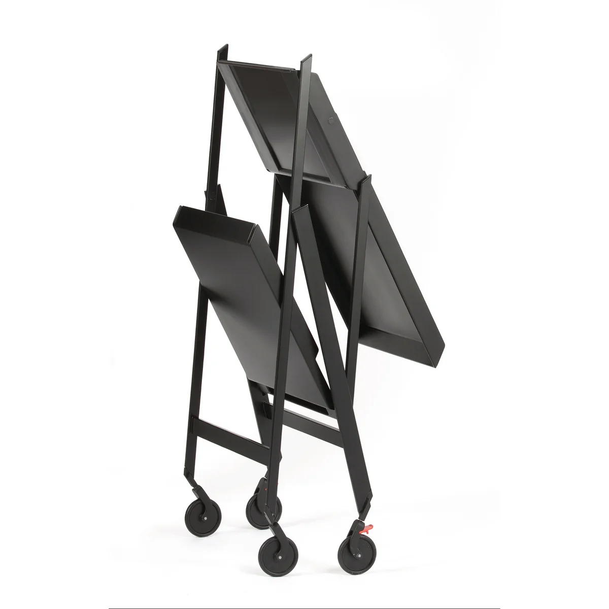 Nach dem Design von Richard Sapper aus den 1970er Jahren wurde der Plico Servierwagen von Alessi entworfen. Der elegante Servierwagen eignet sich ideal als Mini-Bar für die eigenen vier Wände oder zum Servieren von Cocktails und kleinen Snacks auf zwei Ebenen. Alternativ kann der kleine schwarze Wagen auch als Beistelltisch oder Nachttisch genutzt werden. Dabei ist er besonders platzsparend - zusammengeklappt passt Plico ohne Probleme hinter eine Tür oder auch in kleinere Abstellräume.