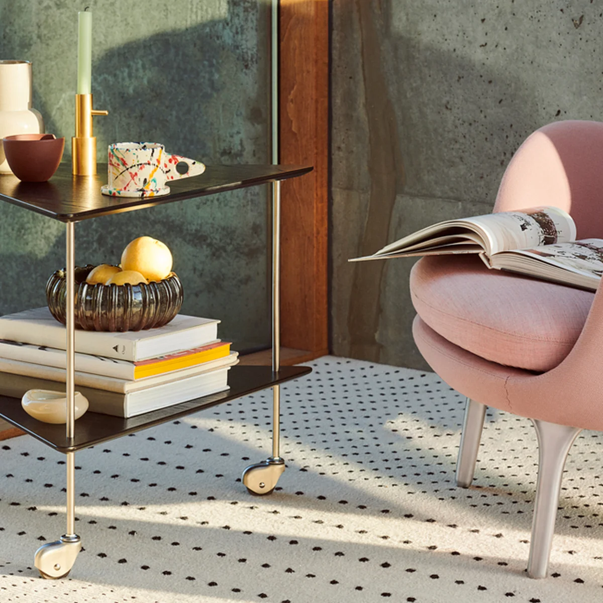 Der AJ Trolley Beistelltisch des dänischen Herstellers Fritz Hansen wurde von Arne Jacobsen ursprünglich für seinen Nachmittagstee entworfen. Dank seiner drei Rollen ist er aber genauso als Servierwagen, Barwagen oder Coffee Table anwendbar. Das schlichte und zeitlose Design fügt sich in jedes Wohnzimmer oder Schlafzimmer ein. Die dreieckige Form macht den Tisch zu einem platzsparenden Accessoire, auf dem sich Getränke sowie Bücher und Vasen gut machen.