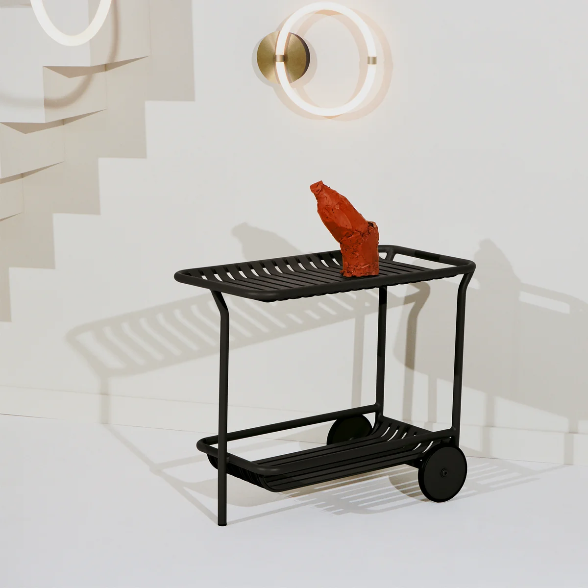 Der Week-End Trolley Outdoor von Petite Friture wurde, wie der Rest der Week-End Serie, für den praktischen und dauerhaften Einsatz konzipiert. Aus Aluminium gefertigt, ist er leicht und seine körnige und matte Epoxy-Lackierung macht ihn UV- und wasserbeständig. Die Lamellenstruktur verhindert zudem, dass sich auf seinen Oberflächen Wasser sammeln kann.