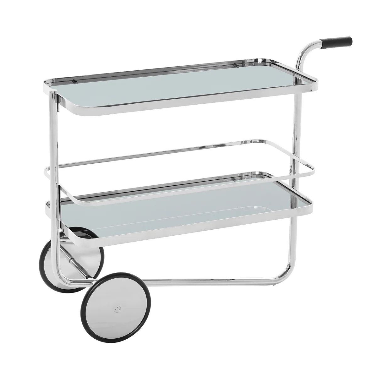 Zwei Einlegeböden aus getöntem Klarglas bieten großzügigen Platz für Gläser, Flaschen und Barzubehör, eignen sich aber ebenso für Bücher oder dekorative Objekte. Die Glasflächen werden von einem Rahmen aus verchromtem Flachstahl gehalten, während eine von Thonet ergänzte Reling auf der unteren Ebene für zusätzliche Sicherheit sorgt. Im Zuge der Neuauflage wurde der Servierwagen leicht vergrößert, um heutigen Wohn- und Nutzungsanforderungen gerecht zu werden – ohne den ikonischen Charakter des Originals zu verlieren.