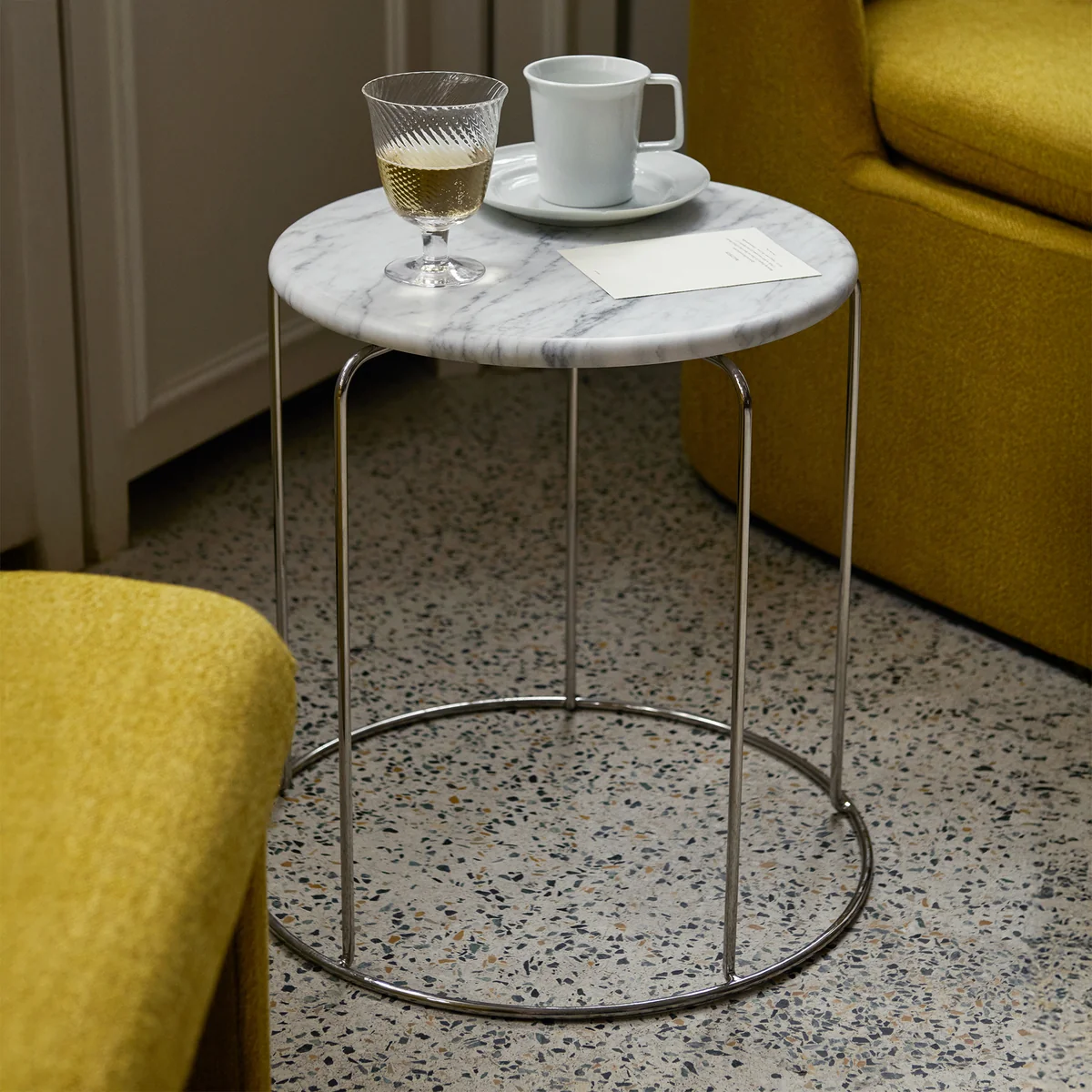 Die VP11 Tischplatte von &Tradition ergänzt den ikonischen Wire Hocker von Verner Panton und verwandelt ihn im Handumdrehen in einen eleganten Beistelltisch. Gefertigt aus edlem Marmor, ruht die Platte sicher auf den konzentrischen Linien des Hockers und verleiht dem minimalistischen Design eine luxuriöse und haptisch spannende Note. So entsteht eine vielseitige Ablagefläche, die sowohl funktional als auch ästhetisch überzeugt – perfekt für Bücher, Getränke oder dekorative Akzente.