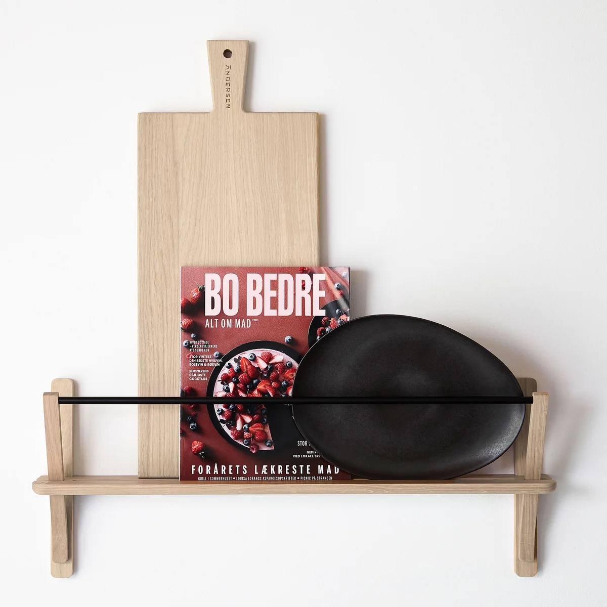 Das aus massiver Eiche gefertigte Regal verkörpert Zeitlosigkeit und Vielseitigkeit und fügt sich nahtlos in eine Vielzahl von Kontexten ein. In der Küche dient es als praktische Aufbewahrungslösung für Teller, Kochbücher und Schneidebretter, während es im Wohnzimmer Zeitschriften und Bilder schön zur Schau stellen kann.