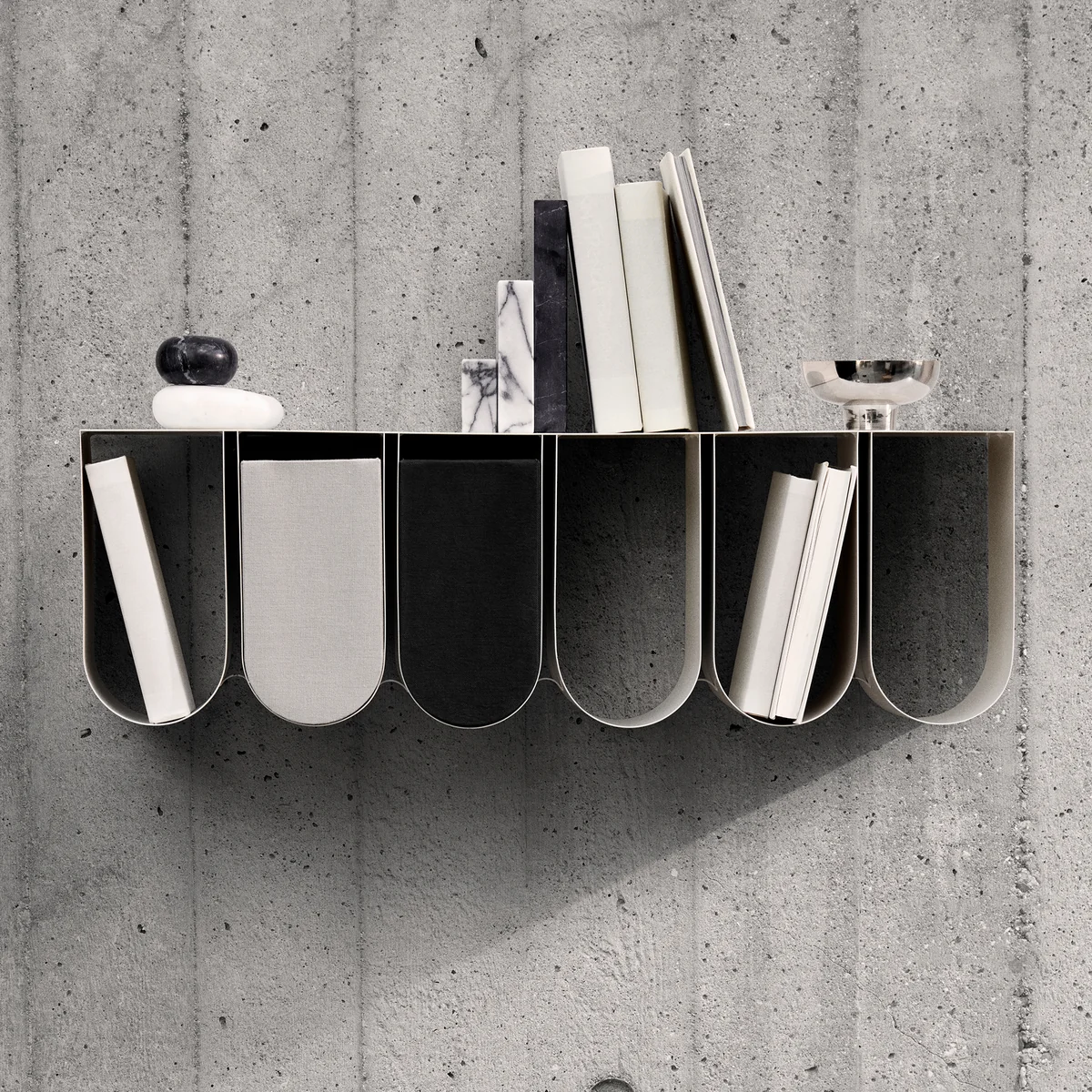 Das Curved Wandregal von Kristina Dam Studio setzt markante und ausdrucksstarke Akzente im Wohnraum. Multifunktional einsetzbar, kann es als Regal an die Wand montiert werden, aber auch im Stand auf dem Boden eingesetzt werden. Mit den kurvigen Aufbewahrungsrahmen ist das Regal ein Must Have und bietet reichlich Platz für die Tools im Badezimmer, im Flur, oder im Wohnzimmer. Als praktischer Beistelltisch kann er als Präsentationsfläche für schöne Vasen dienen, die das dänische Design des Regals akzentuieren und die wohnliche Hygge in der Einrichtung wirken lassen. Das Curved Wandregal ist in unterschiedlichen Ausführungen erhältlich.