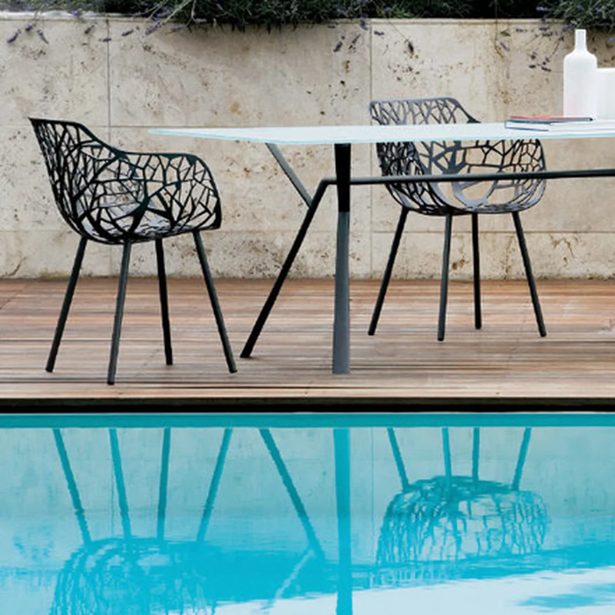 Die hier angebotene Outdoor-Variante besteht aus pulverbeschichtetem Aluminium. Forest überzeugt durch hohen Sitzkomfort und ein unverwechselbares Design. Die verästelte Struktur der Sitzschale weckt Assoziationen an einen Wald (engl. Forest), woher der filigrane Gartenstuhl auch seinen Namen hat.