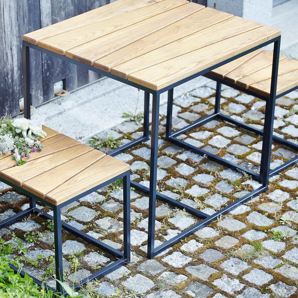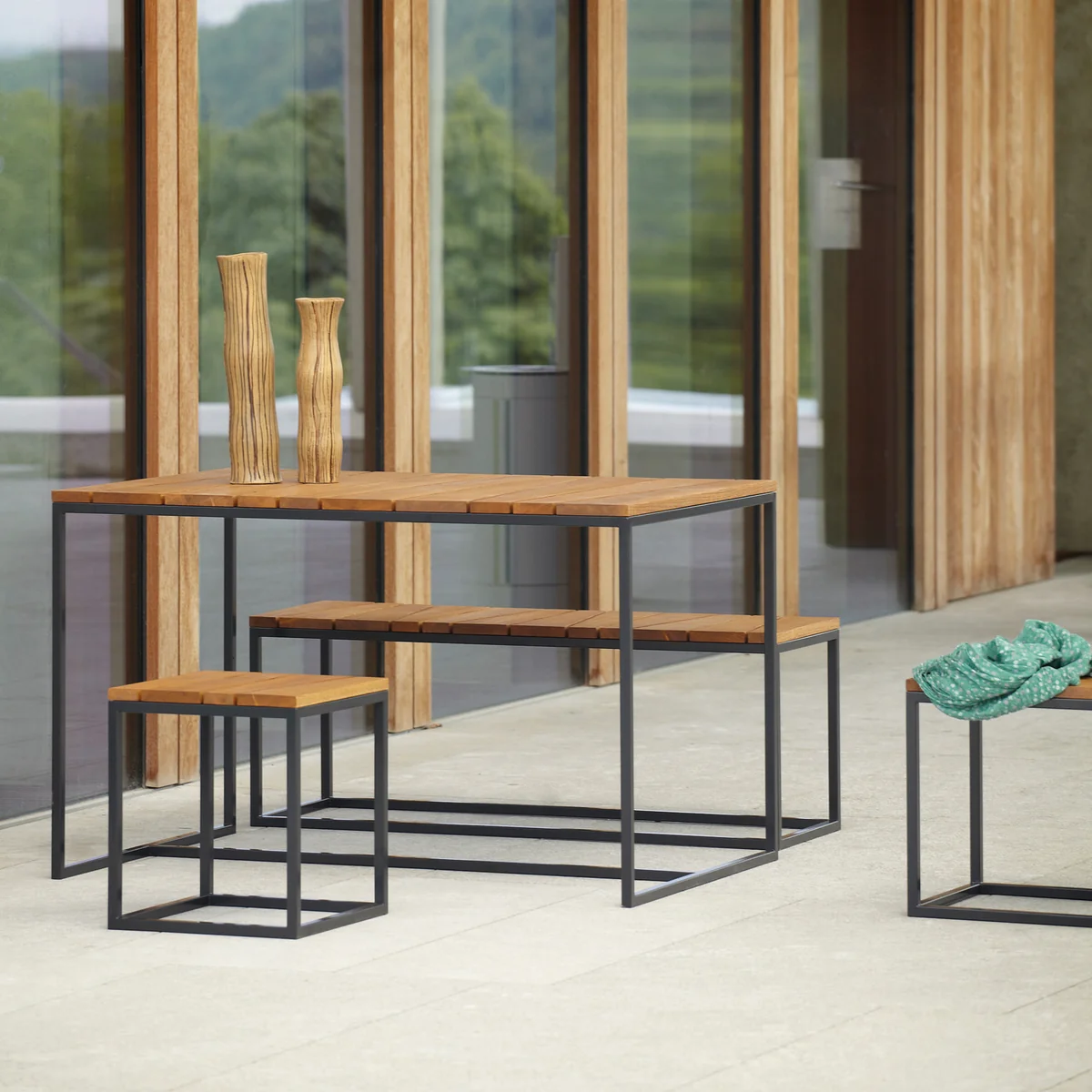 Optisch ist Alois von klaren Formen gekennzeichnet. Der rechteckige Rahmen der Möbel wird von Sitz- und Ablageflächen aus naturbelassenen Holzleisten ergänzt. Bank und Hocker passen mit ihren Abmessungen perfekt unter den Tisch und können dort platzsparend verstaut werden. Aufgrund der hochwertigen Materialien eignet sich Alois perfekt für den Außenbereich.