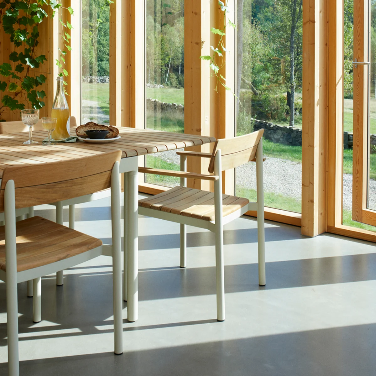 Der Pelagus Stuhl von Skagerak kann ideal mit dem Pelagus Tisch kombiniert werden. Es können insgesamt bis zu fünf Stühle übereinander gestapelt werden.