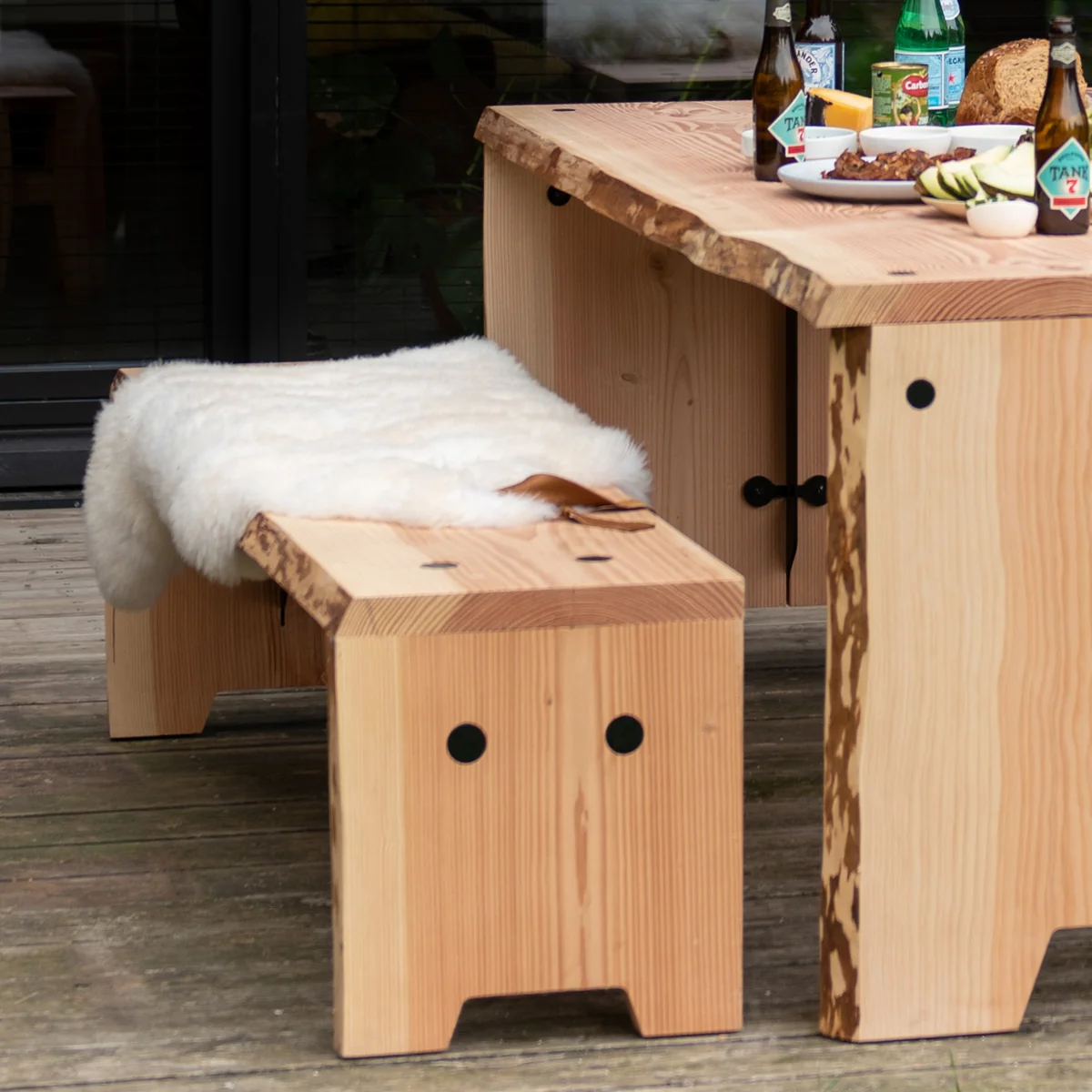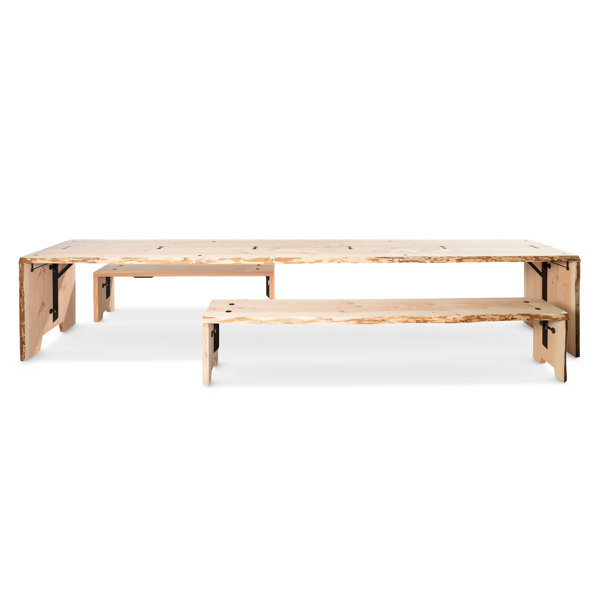 Diese Bank besteht aus drei Douglasie-Holzplatten, die durch galvanisierte und pulverbeschichtete Stahlverbindungen in Form gehalten werden. Die natürlichen Kanten der Holzplatten wurden erhalten, wodurch ihre Form der des Baums folgt und sogar Anzeichen der ursprünglichen Rinde erkennen lässt. Die rohe und natürliche Maserung sorgt für eine warme Atmosphäre in der Umgebung – egal ob auf der Terrasse oder im Esszimmer.