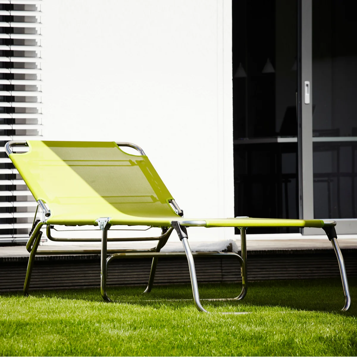 Die Rückenlehne lässt sich in vier verschiedene Positionen bringen, sodass die Dreibeinliege immer die favorisierte Sitzposition bietet. Auch in der großen Version steht die Amigo Sonnenliege auf ihren drei Beinen äußerst stabil. Das Gestell besteht aus Aluminium - so ist es stabil und leicht zugleich.