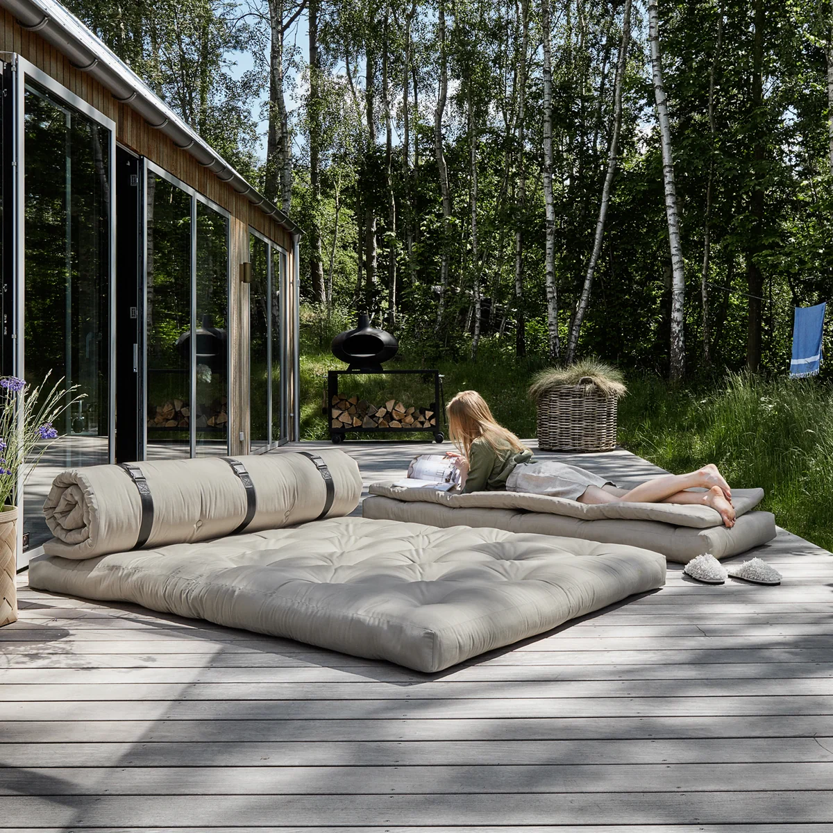 Der Buckle Up OUT Chair von Karup Design lädt zum entspannten Sonnenbaden ein und kann bei Bedarf auch für ein kleines Nickerchen genutzt werden. Er besteht aus zwei Matratzen, wobei eine gefaltet als Sitzfläche dient und die anderen zusammengerollt und mit Gurten verschnürt als Rückenlehne fungiert. Löst man die Gurte und rollt die Lehne auf der dicken Matratze aus, so entsteht ein komfortables Outdoor-Bett mit den Maßen 200 x 70 cm, auf dem es sich gemütlich entspannen lässt.