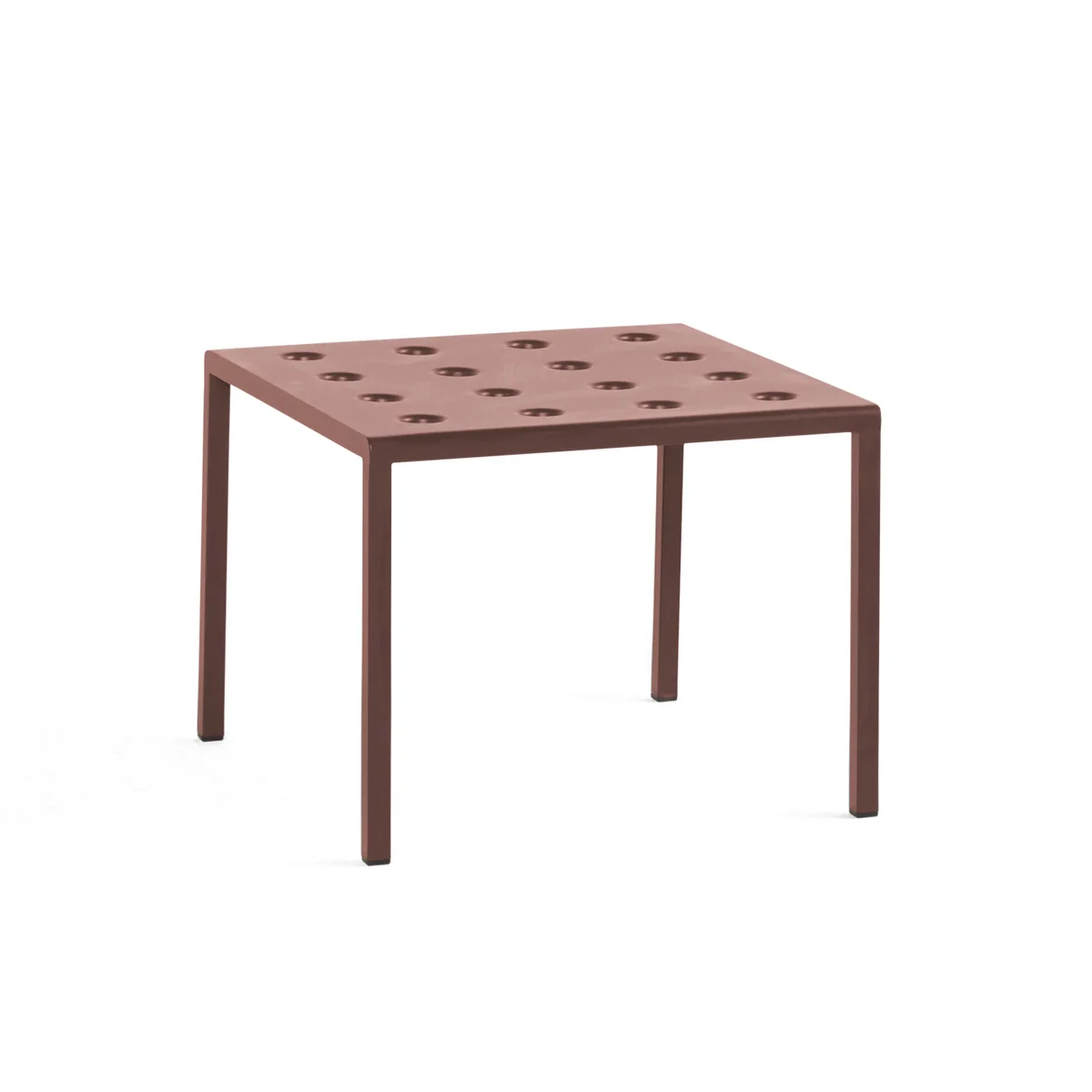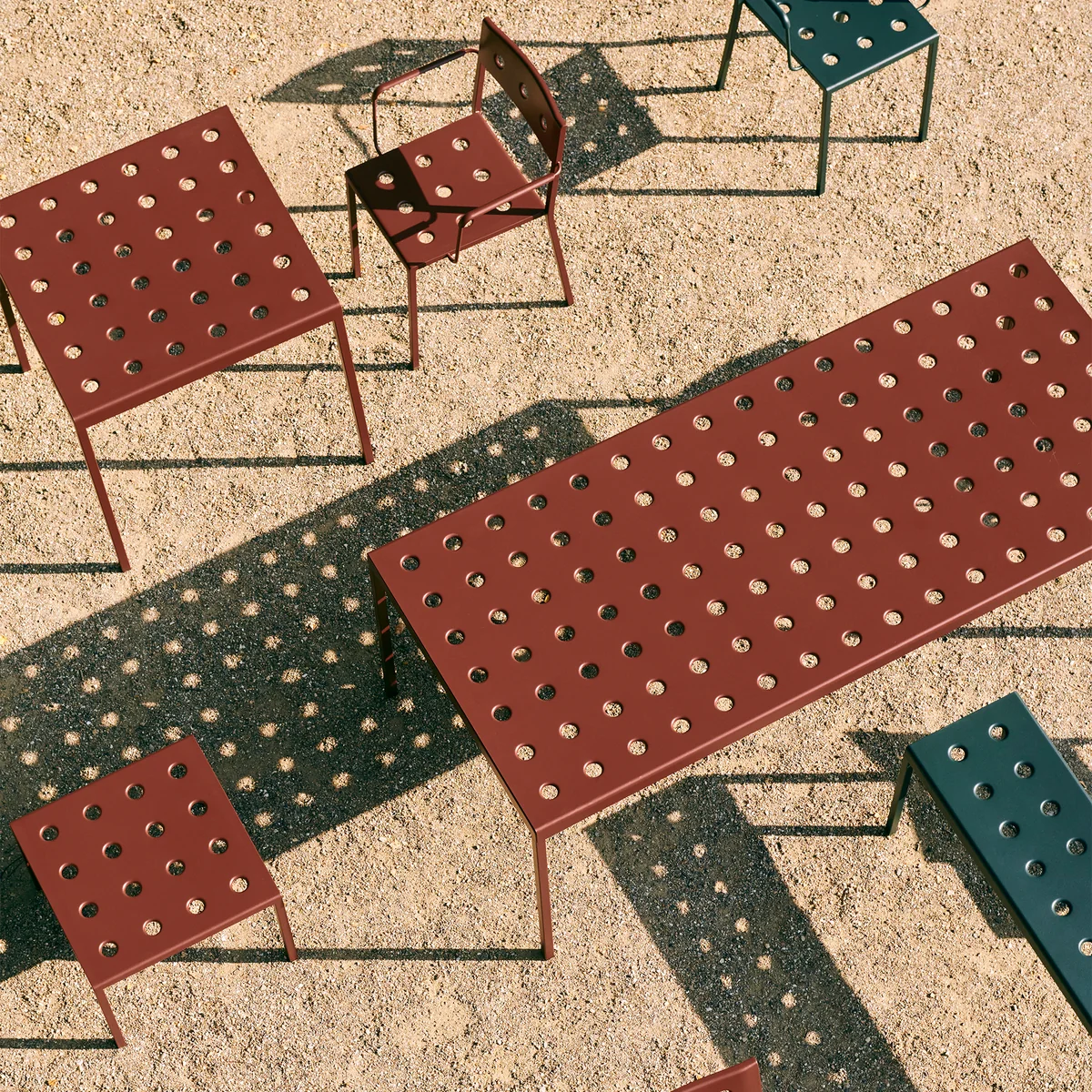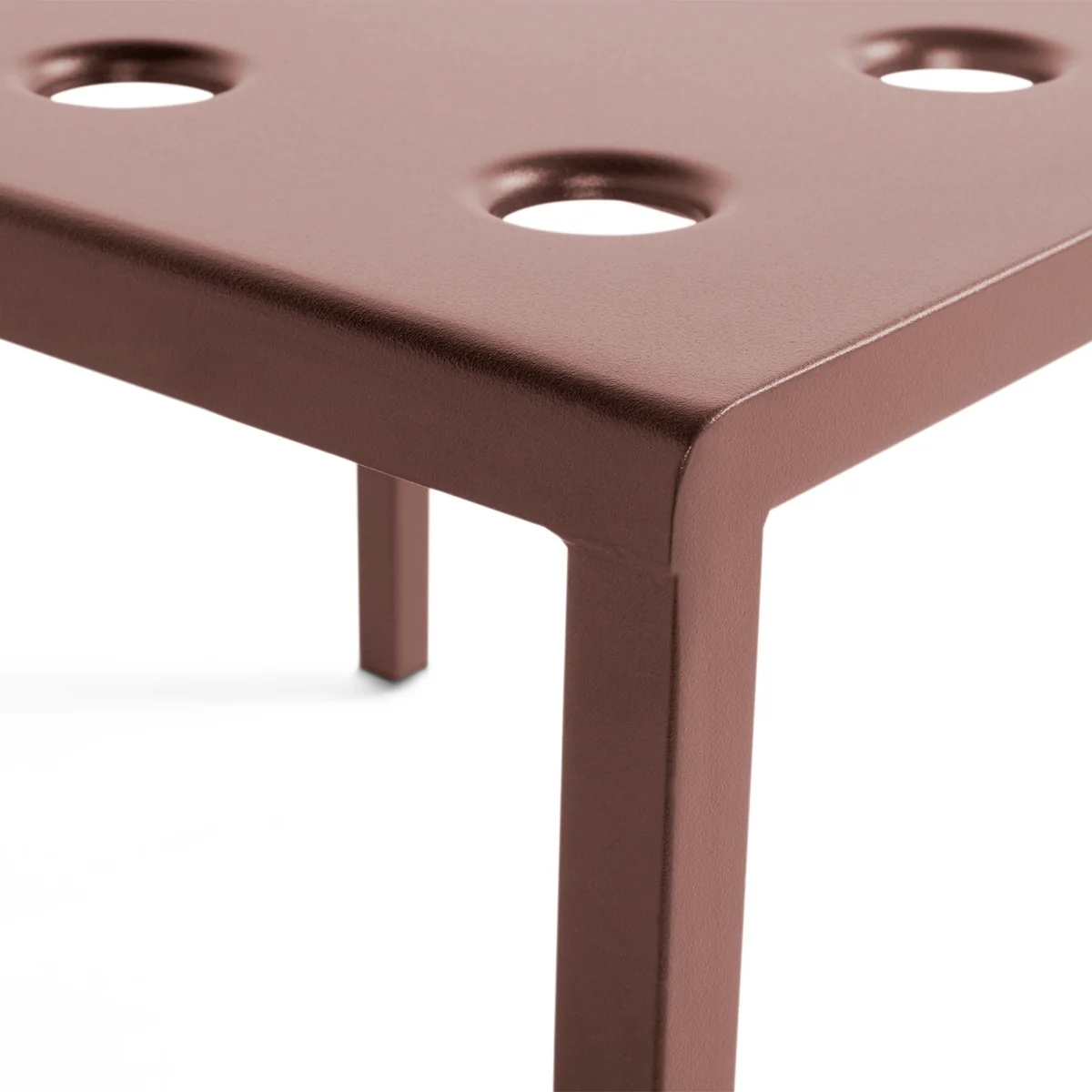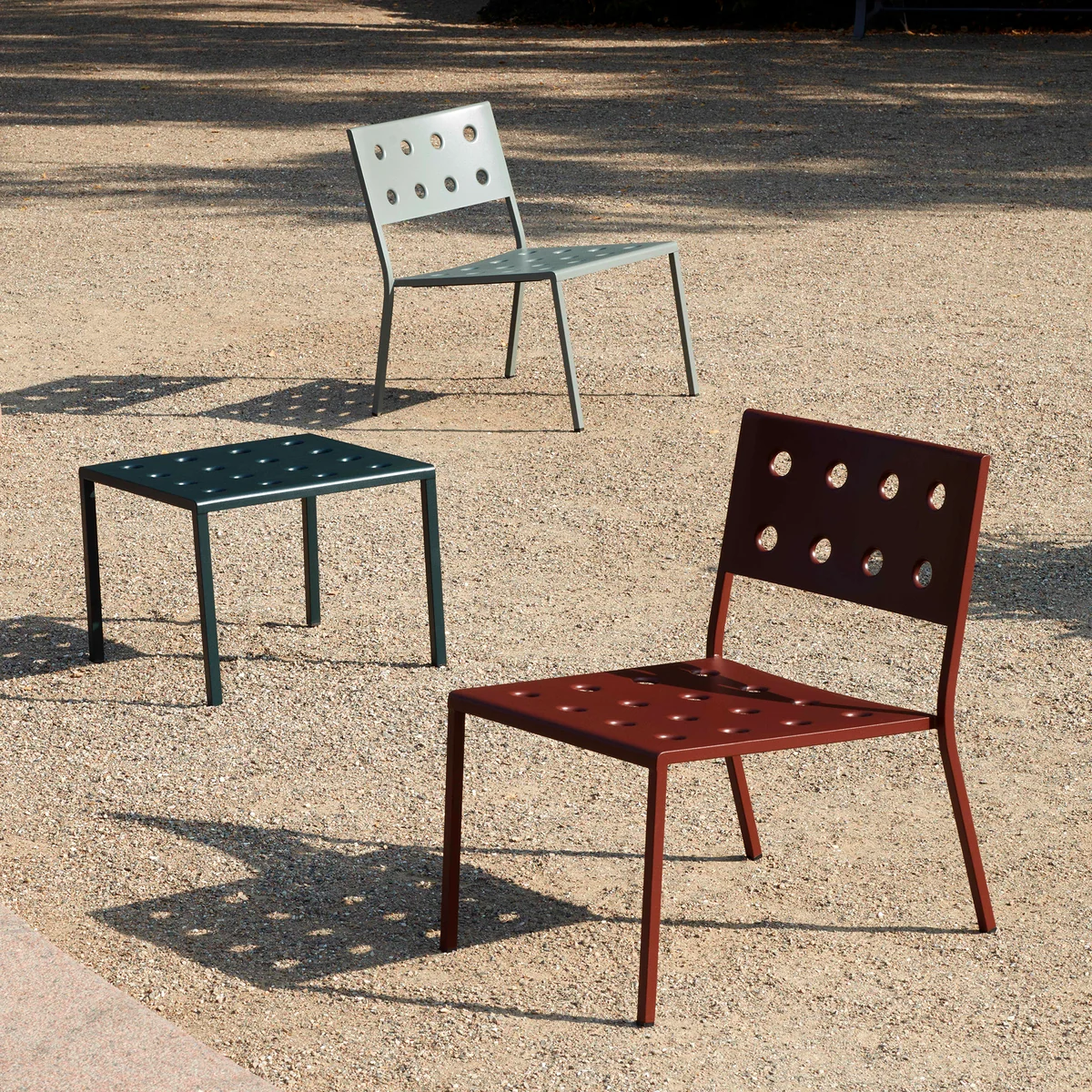 Der Balcony Beistelltisch von Ronan und Erwan Bouroullec für HAY ist ein eleganter Beistelltisch für den Außenbereich. Das schlichte, rechteckige Design erhält durch seine schlanken Beine einen lockeren Touch. Die zahlreichen Löcher auf der Tischoberfläche verleihen der Konstruktion Stabilität, wodurch zugleich ein besonderer Ausdruck entsteht. Balcony wird aus pulverbeschichtetem Stahl gefertigt und ist mit einer Beschichtung versehen, welche optimale Widerstandsfähigkeit und Langlebigkeit gewährleistet. So kann der Beistelltisch ideal im Außenbereich genutzt werden.