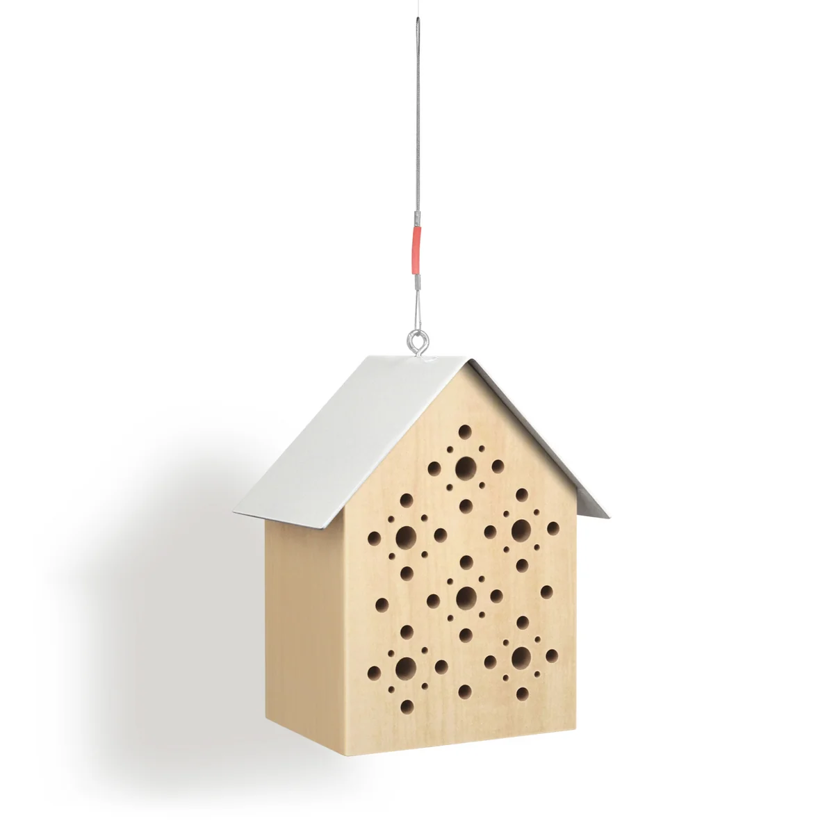 Designerin Jette Scheib verwendete bei dem Bee´s Inn unbehandeltes Lindenholz - ein bevorzugtes Holz bei Insekten - das mit einem pulverbeschichtetem Stahldach vor Regen geschützt wird.