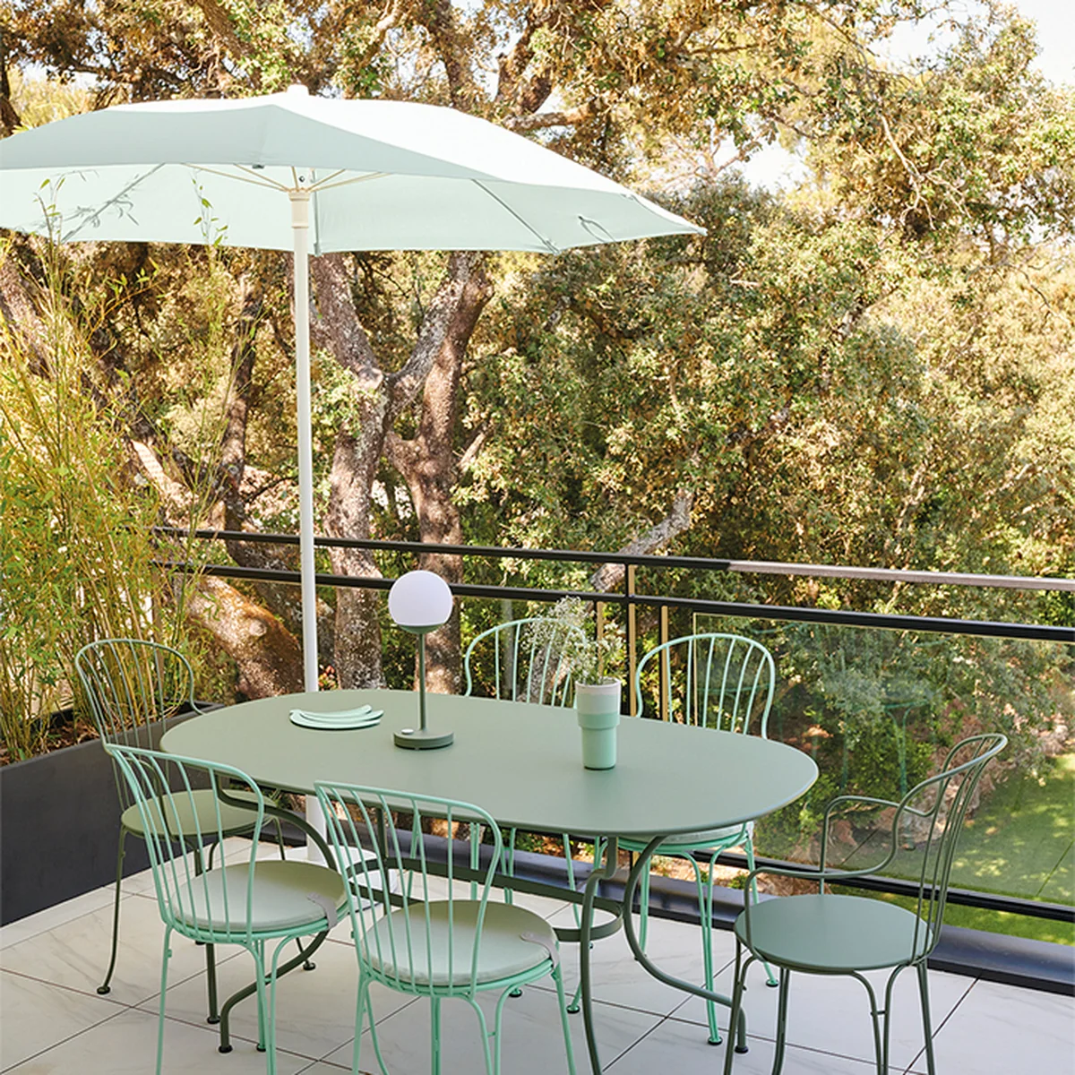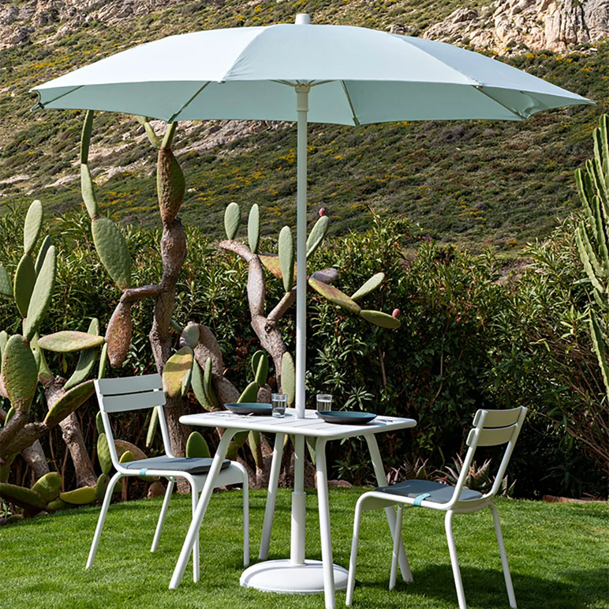 Der Shadoo Sonnenschirm von Fermob bietet Ihnen optimalen Schutz vor der Sonne. Der 2,5 Meter breite Schirm wird aus starkem, reißfestem Sunbrella-Gewebe gefertigt. Sunbrella-Gewebe hat den Vorteil, dass es wasserabweisend und resistent gegen UV-Strahlen, Flecken und Schimmel ist. Durch den Aluminiumstiel und die Fiberglasrippen ist das gesamte Konstrukt robust, lässt sich jedoch gleichzeitig problemlos nach Belieben bewegen. Der Stiel kann in Zwei geteilt werden, sodass er wenig Platz einnimmt und somit simpel verstaut werden kann.