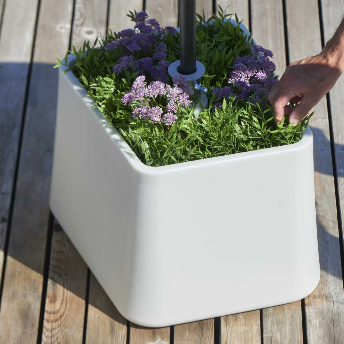 Der Topf aus Polyethylen kann sowohl als Schirmständer benutzt, als auch bepflanzt werden. Die Blumenerde im Topf und die Wurzeln der Pflanzen sorgen dabei für zusätzliche Stabilität des Schirms. Durch Löcher im Boden kommt es nicht zu Staunässe im Pflanzgefäß.