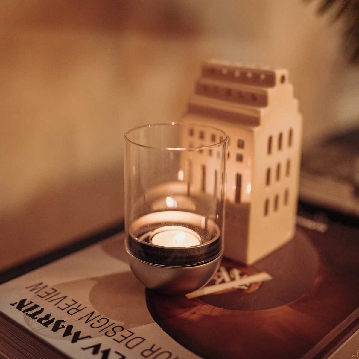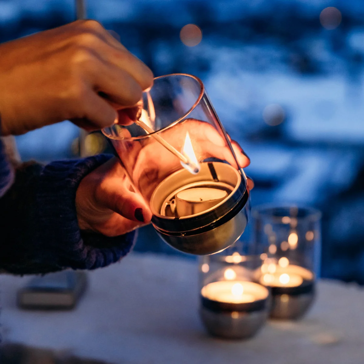 Diese Funktion ist besonders beim Anzünden von großem Vorteil, indem das Windlicht einfach zur Seite geneigt wird und die Kerze somit angezündet werden kann, ohne dass man sich die Finger verbrennt. Ebenso leicht lässt sich löschen: Dabei wird das Teelicht einfach umgedreht und schon erstickt die Flamme. So geht kein Wachs beim Auspusten daneben und der Tisch bleibt sauber. Wird das Gravity Candle Windlicht nicht genutzt, so kann es auf dem Kopf stehen bleiben und es gelangt kein Schmutz oder Laub in das Glas.