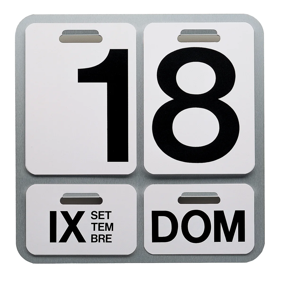 Der Formosa Wand-Kalender ist in mehreren Sprachen erhältlich. Er besteht aus eloxiertem Aluminium mit lithographiertem PVC-Blättern.