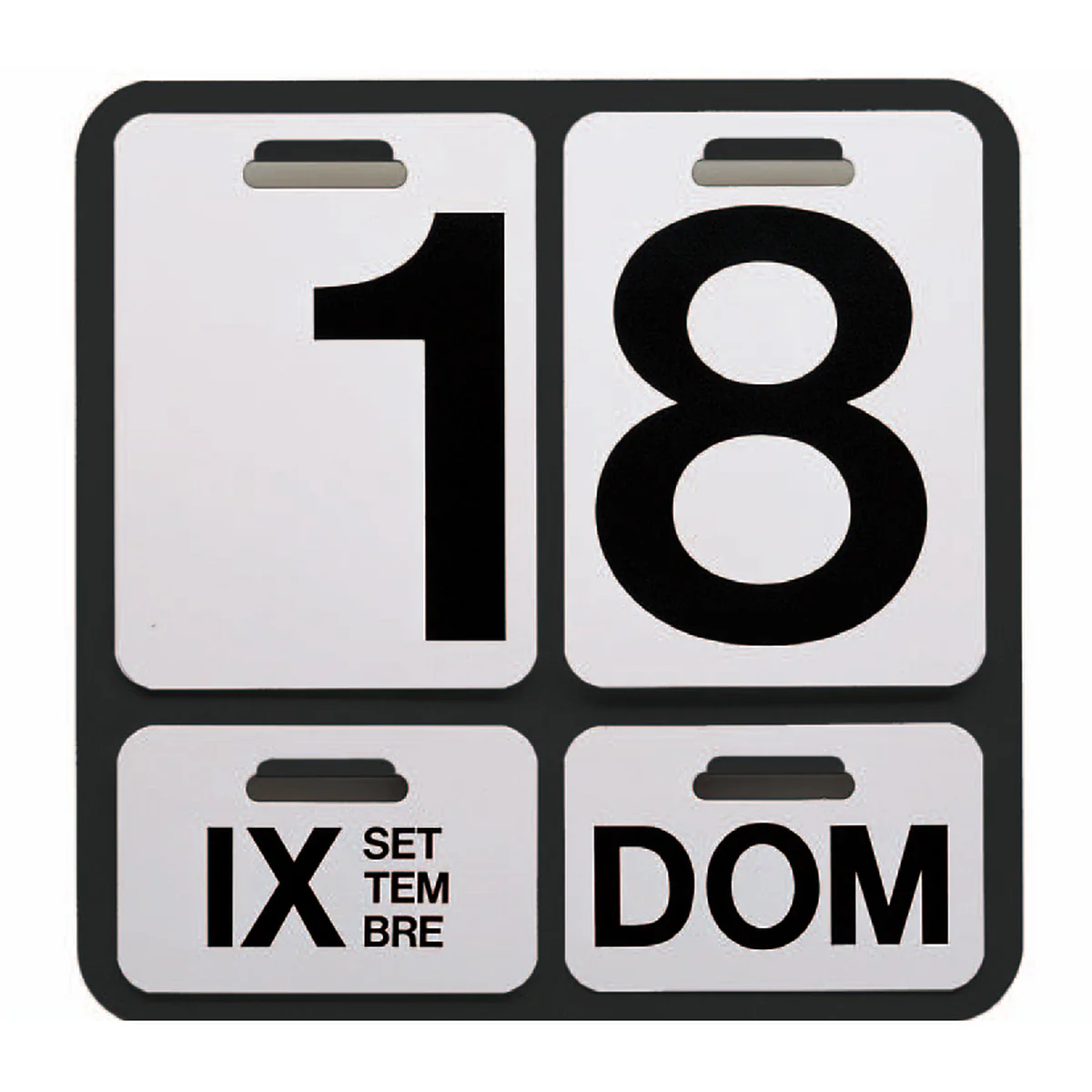 Wahlweise ist die Grundplatte des Danese Milano Formosa Wandkalenders in schwarz oder aluminum-farben mit roter oder schwarzer Beschriftung verfügbar.