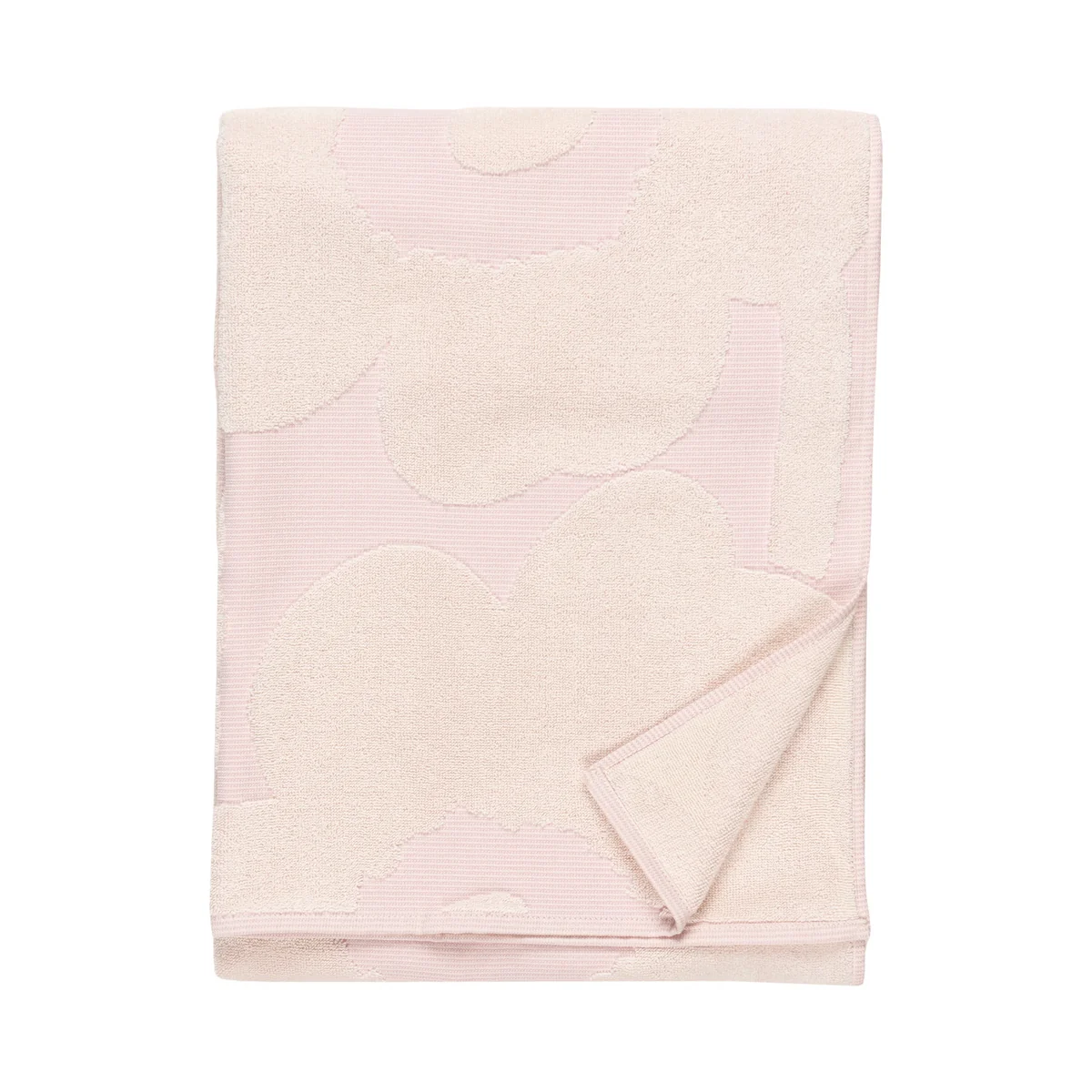 Das Unikko Handtuch-Set besteht aus drei Handtüchern, die aus organischem Baumwoll-Frottee gefertigt sind. Das Set umfasst ein Badetuch (70 x 150 cm), ein Handtuch (50 x 70 cm) und ein Gästetuch (30 x 50 cm). Die Vorderseite der Handtücher ist mit dem geprägten Unikko-Muster versehen, während die Rückseite glatt und einfarbig ist.