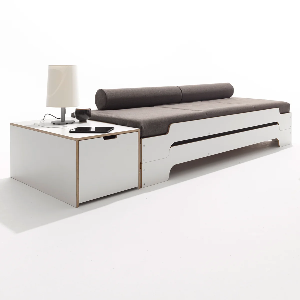 Die Müller Small Living Stapelliege eignet sich vorzüglich für kleinere Apartments oder Gästezimmer, da zwei Stapelliegen übereinander gestapelt sehr platzsparend sind und nebeneinander aufgebaut, in Windeseile zu einem stilvollen Doppelbett umfunktioniert werden können.