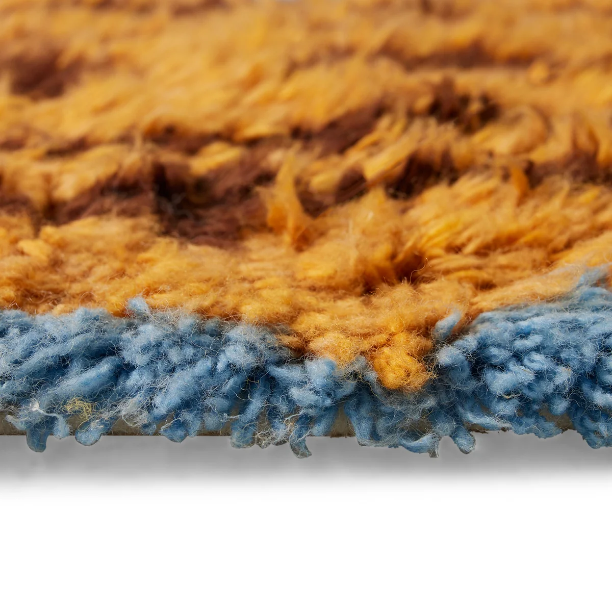 Mit dem Wollteppich Funk aus dem niederländischen Hause HKliving wird jedem Wohnraum Schwung verliehen. Dieser farbenfrohe Teppich ist ideal, um den Charme und die Gemütlichkeit des Flurs oder Schlafzimmers zu erhöhen. Er besticht durch eine Kombination aus ruhigem Blau und lebendigem Sonnenblumengelb, die in einem organischen, dynamischen Muster angeordnet sind.