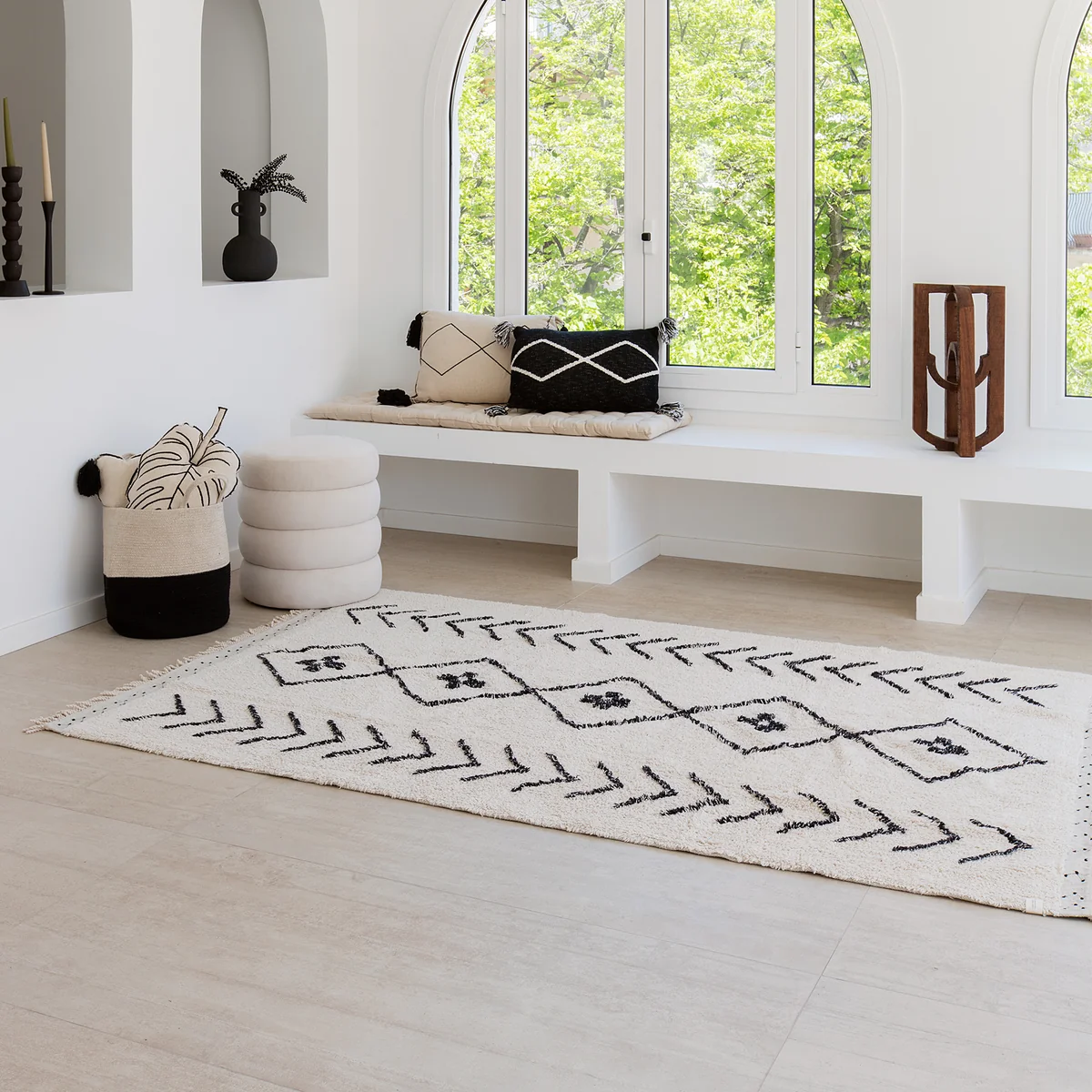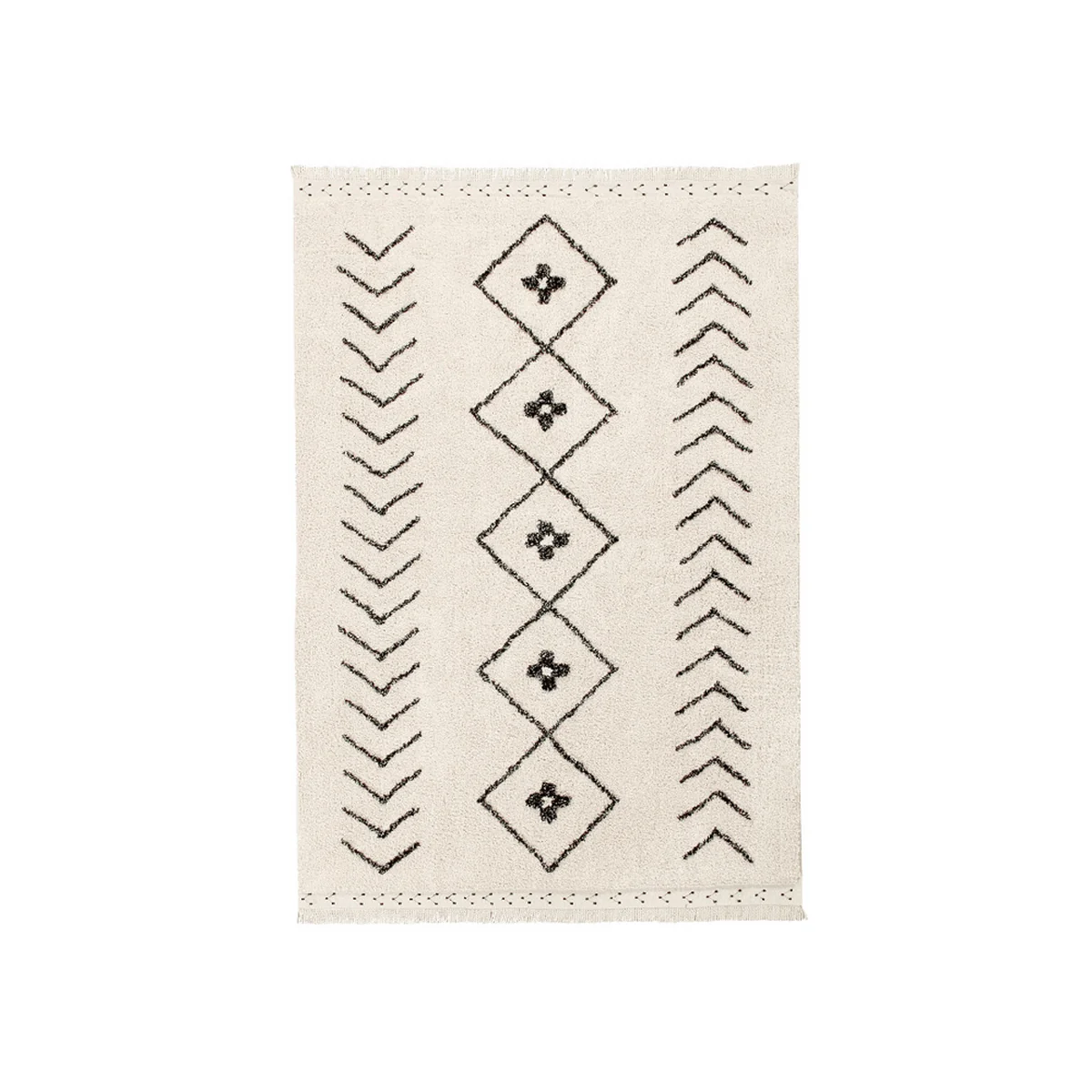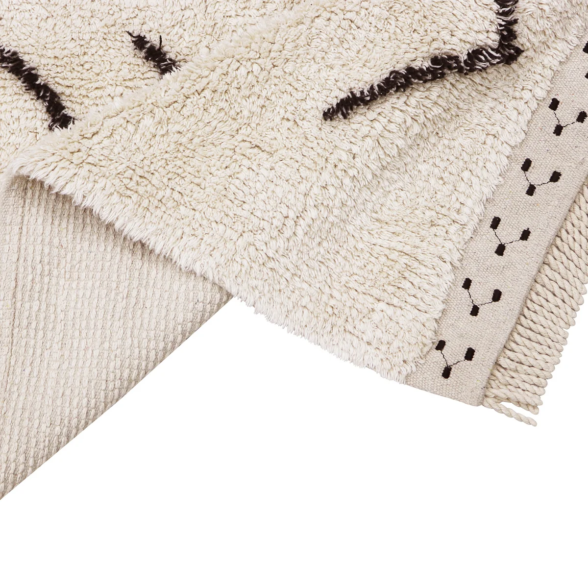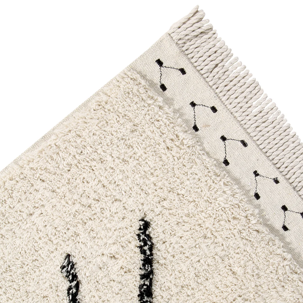 Der Bereber Rhombs Teppich aus dem Hause Lorena Canals zeichnet sich durch seine handgefertigte Qualität aus. Der Teppich wird aus einer Baumwoll-Basis mit recycelten Textilfasern gefertigt. Bereber Rhombs bietet mit seinen Stickerein an den Fransen und dem Melange-Tufting einen wunderbaren Vintage-Flair.