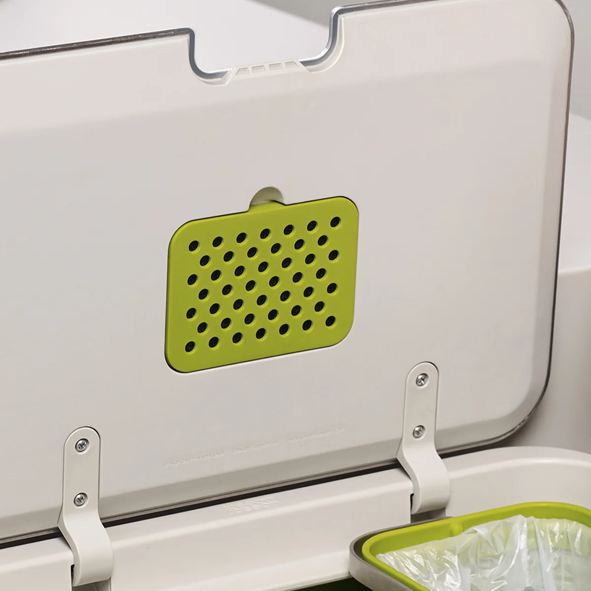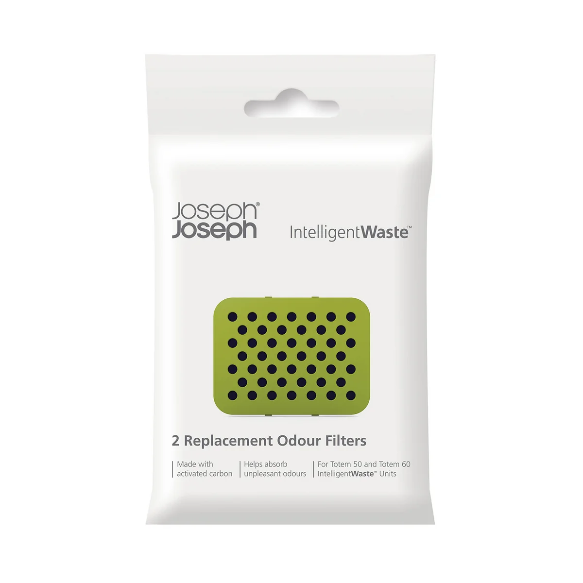 Das gesamte Abfallsystem Totem von Joseph Joseph wird durch einen effizienten Geruchsfilter ergänzt. Er filtert die schlechten Gerüche, damit der Abfalleimer nicht halb-voll entleert werden muss weil der Geruch des Abfalls störend in der Luft hängt. Der Aktiv-Kohlefilter ist diskret an der Unterseite des Deckels angebracht und kann leicht ausgewechselt werden.