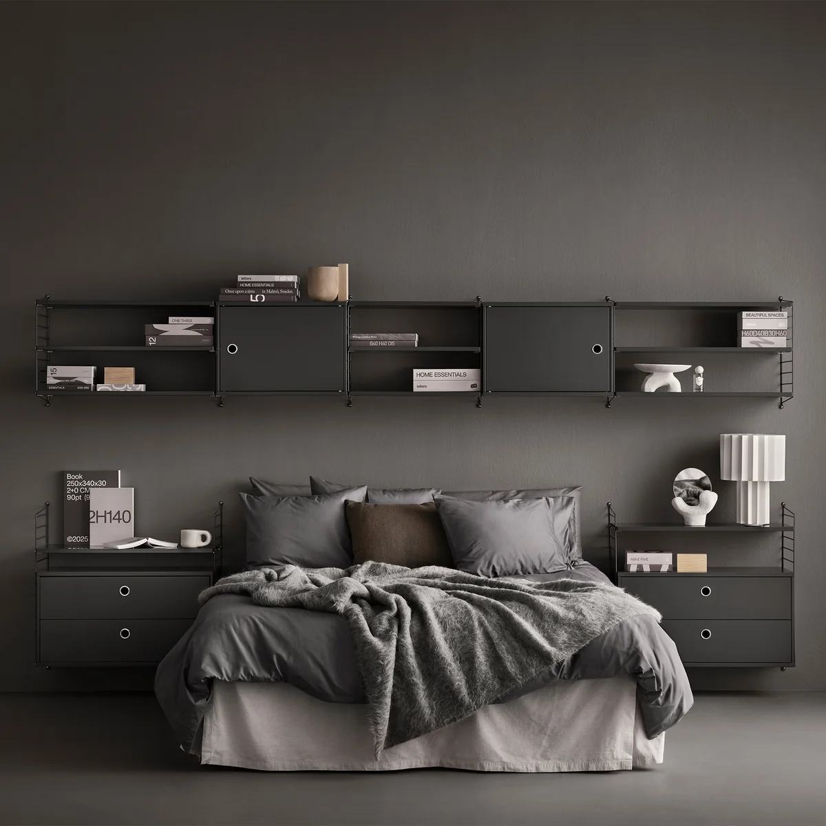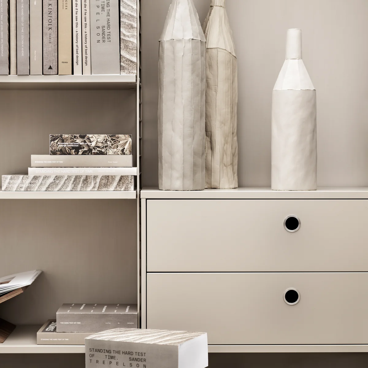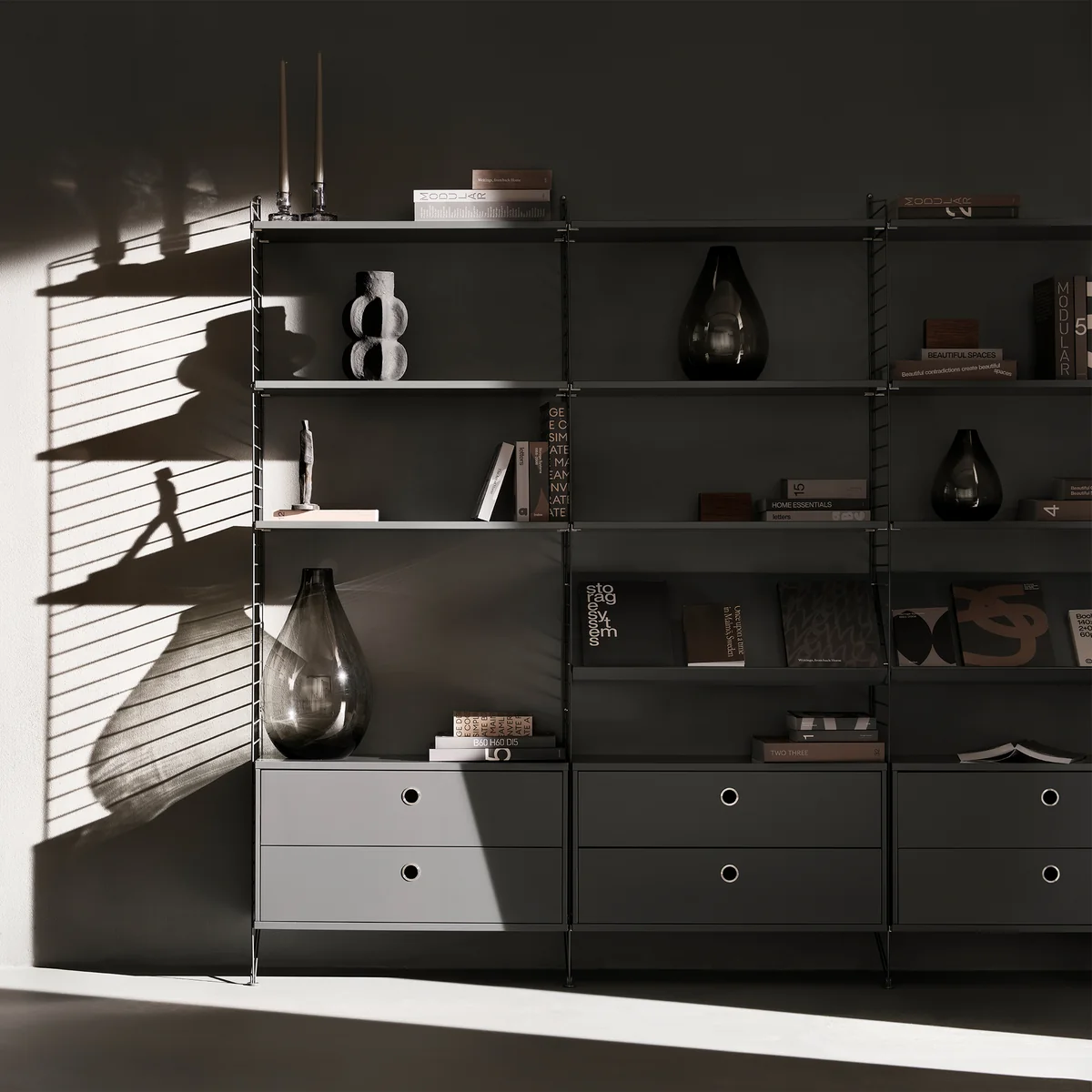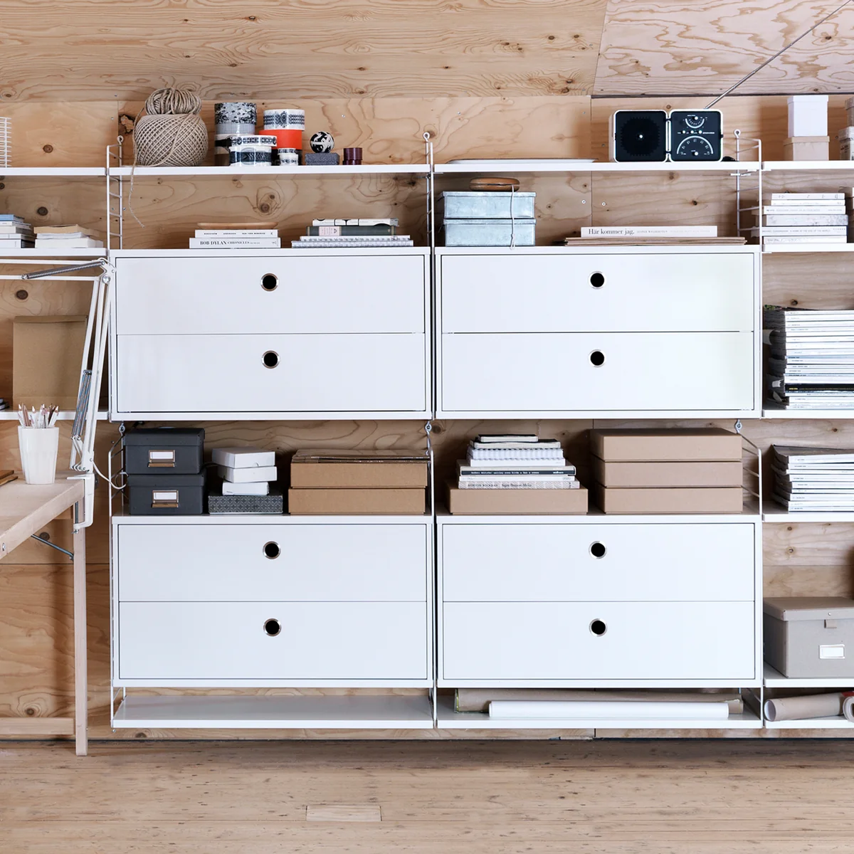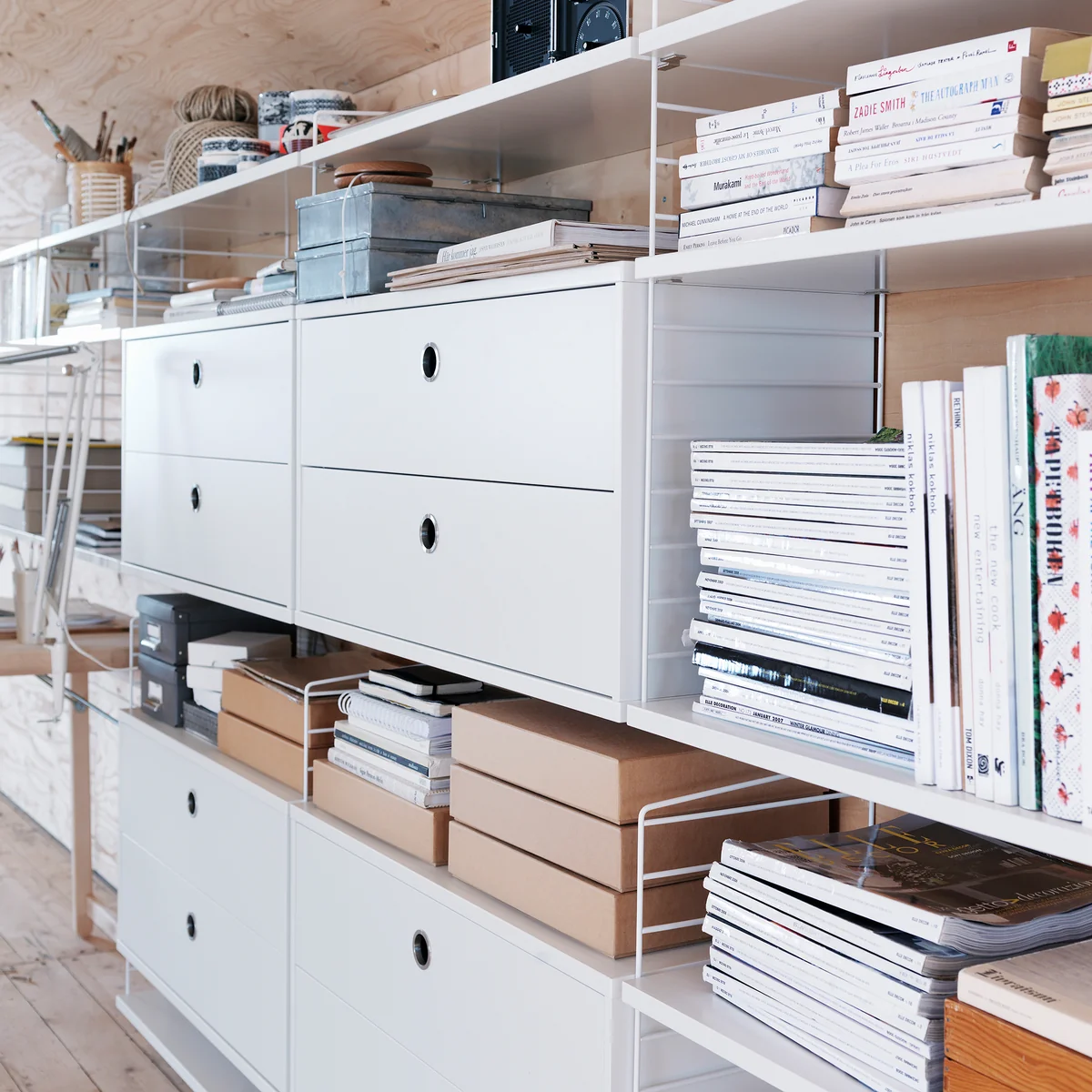 Das Schrankmodul mit Schubladen von String lässt das Regalsystem zum organisierten Schrank werden und Gegenstände, die nicht sofort sichtbar sein sollen, können in den Schubladen des Moduls dezent verschwinden. Außerdem dient die Oberseite des Schranks auch gleichzeitig als Ablagefläche.
