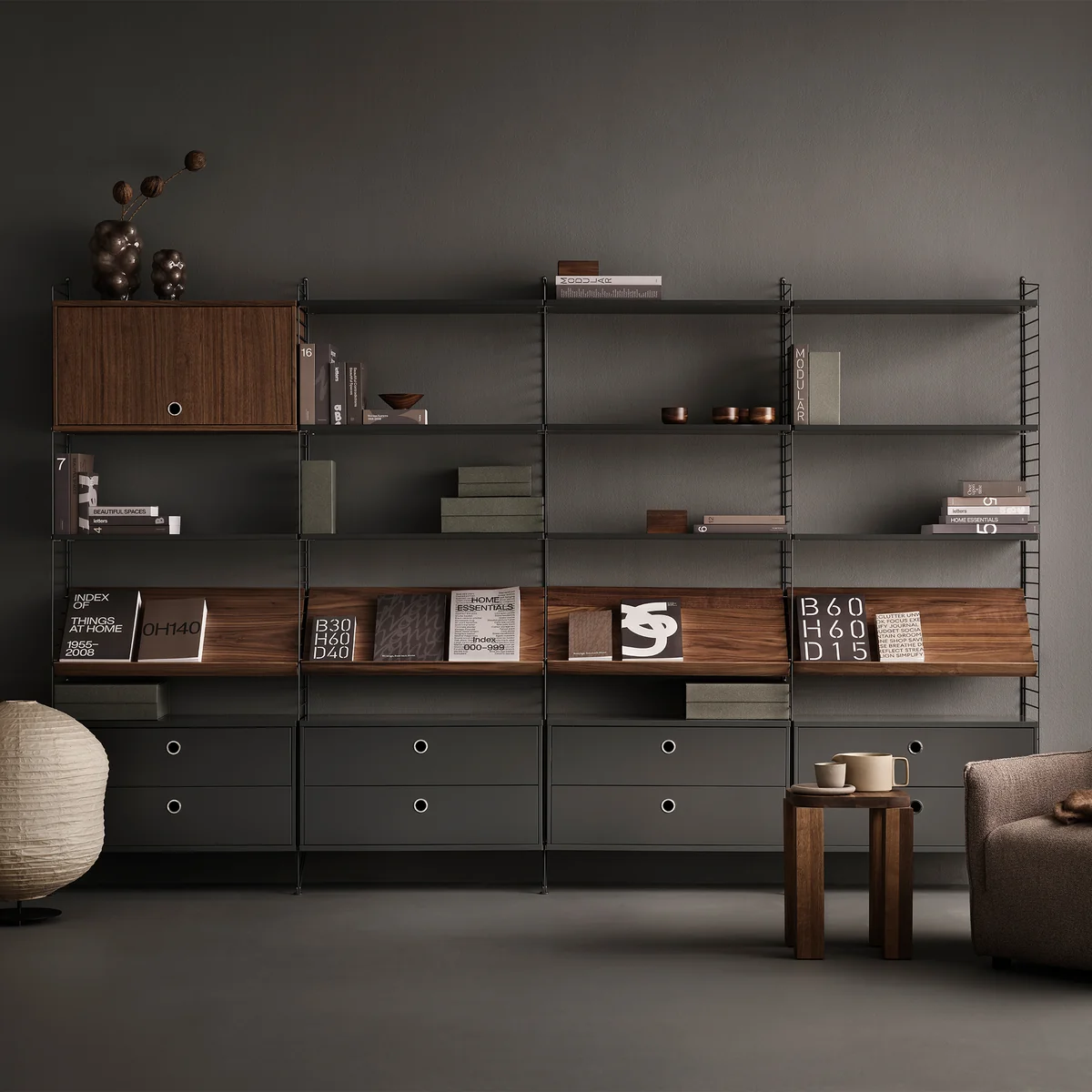 Das Schrankelement von String ist - passend zu de Regalbrettern und Metallleitern - in verschiedenen Lackierungen und Hölzern erhältlich.