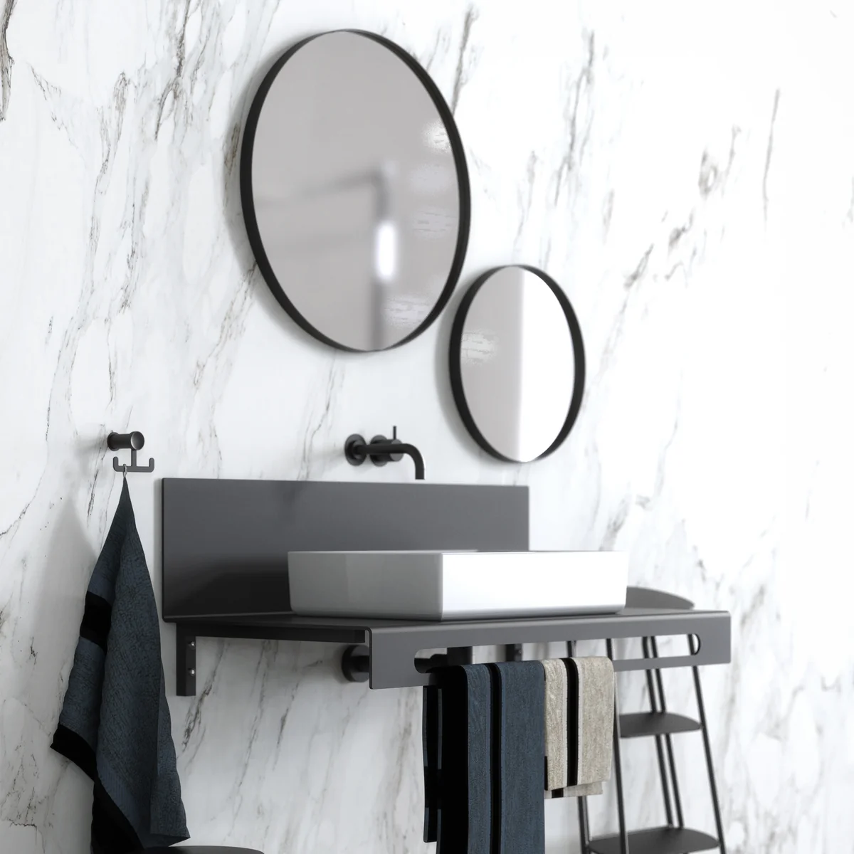 Das Spiegelglas ist in einen schmalen Aluminiumrahmen eingefasst, der für eine definierte Kontur sorgt und in verschiedenen Farben verfügbar ist. Erhältlich ist der vom Designstudio Bønnelycke entworfene Spiegel mit unterschiedlichen Durchmessern.